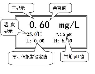 ● 多參數同時顯示:可同時顯示余氯、PH值、溫度值、高點報警設置值、低點報警設置值、以及儀表是否處于高或低報警狀態等。各項參數一目了然。